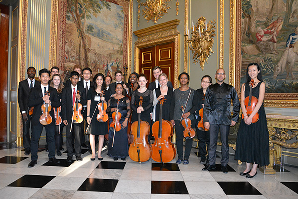 In 2014 the Commonwealth Youth Orchestra invited Jemima Khan (front row, 3rd from the left) of the India National Youth Orchestra to take part in concerts and workshops as part of the marking of the Commonwealth Games 2014, in the Glasgow Royal Concert Hall, St James’s Palace and Marlborough House.
