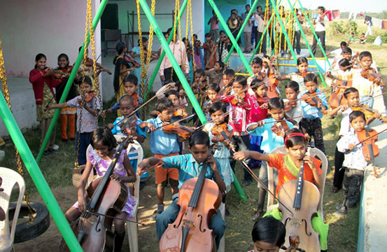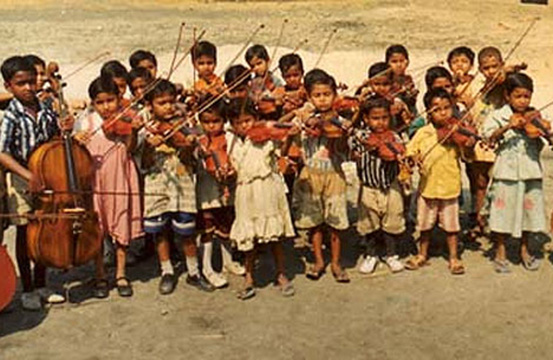 TThe Mathieson Music School, in a village on the edges of Calcutta, provides the children with tuition in all subjects but has a particular focus on music, in both Western and Indian traditions.
